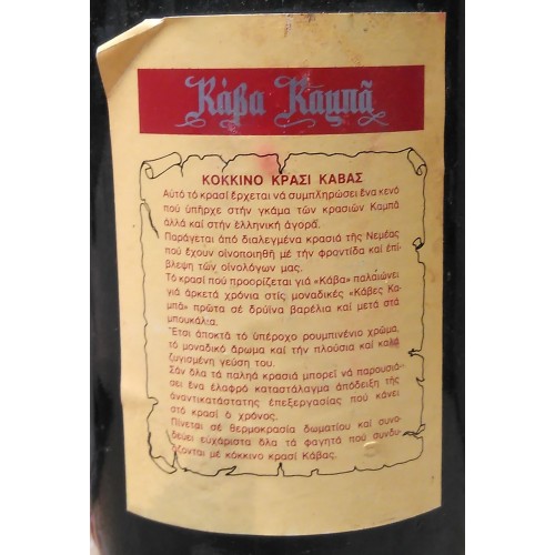 Αυτό το κρασί έρχετε να συμπληρώσει ένα κενό που υπήρχε στην γκάμα των Καμπά αλλά και στην Ελληνική αγορά. Παράγεται από διαλεγμένα κρασιά της Νεμέας που έχουν οινοποιηθή με την φροντίδα και επίβλεψη των οινολόγων μας. Το κρασί που προορίζεται για "Κάβα" παλαιώνει για αρκετά χρόνια στις μοναδικές "Κάβες Καμπά" πρώτα σε δρύινα βαρέλια και μετλα στα μπουκάλια. Έτσι αποκτά το υπέροχο ρουμπινένιο χρώμα, το μοναδικό άρωμα και την πλούσια και καλά ζυγισμένη γεύση του. Σαν όλα τα παληά κρασιά μπορεί παρουσιάσει ένα ελαφρό καταστάλαγμα απόδειξη της αναντικατάστατης επεξεργασίας που κάνει στο κρασί ο χρόνος. Πίνεται στην θερμοκρασία δωματίου και συνοδέυει ευχάριστα όλα τα φαγητά που συνοδέυονται με κόκκινο κρασί Κάβας.