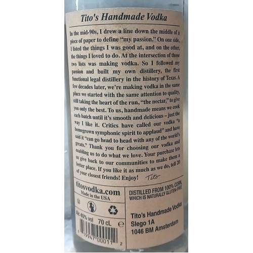 Η Tito's Handmade Vodka μας έρχεται από το Austin του Texas. Ο όρος handmade (χειροποίητη), έχει κυριολεκτική σημασία αφού ακόμα και σήμερα ο Tito Beveridge φροντίζει να την κρατάει μοναδική. Από το 1995 που αποφάσισε να τη δημιουργήσει, εγκαταστάθηκε στο παλαιότερο, νόμιμο αποστακτήριο και μέχρι και σήμερα βρίσκεται ακόμα εκεί.